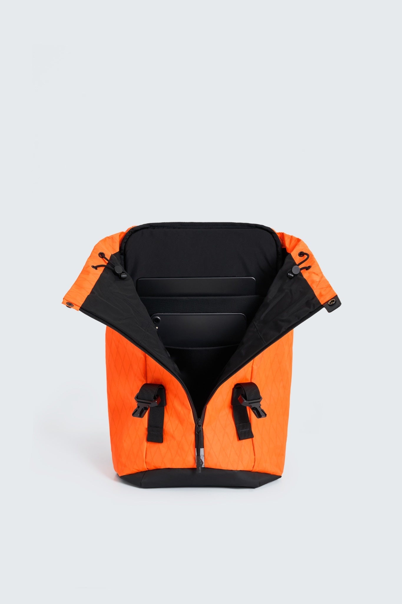 An everyday city backpack tuned for an active pace. It carries your regular kit, as well as a laptop, charger, book, bottle, wallet, keys, etc. The full‑length V‑zip gives an instant overview. Inside are a padded device sleeve and two side pockets.